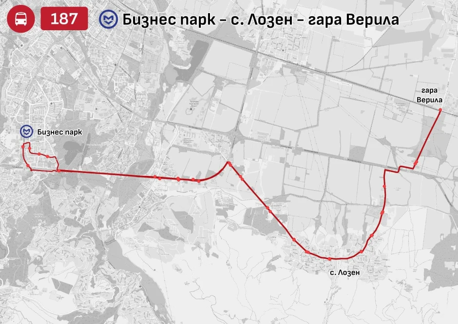 • от метростанция “Бизнес парк”: Софийски околовръстен път – ул. “Лозен” – ул. “Съединение” /с. Лозен/ – гара “Верила”