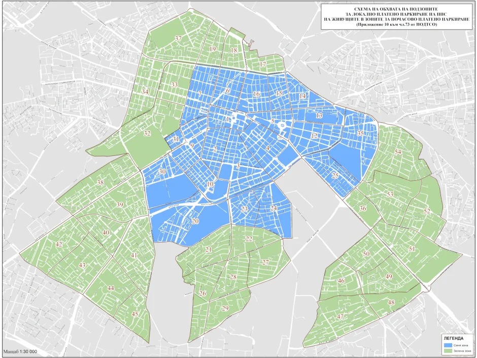 „чл. 55 (1) Режимът на почасово платено паркиране е обособен в две зони: “Синя зона” и “Зелена зона” с време на действие, както следва: